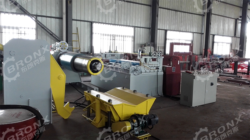 該生產線是將一定寬的金屬卷料薄板在板寬方向縱剪成多條所需寬度的帶材并進行成品工件的卷取的成套設備。由開卷機、對中裝置、縱剪主機、阻尼預分料、收卷機、電氣控制控制系統等組成。